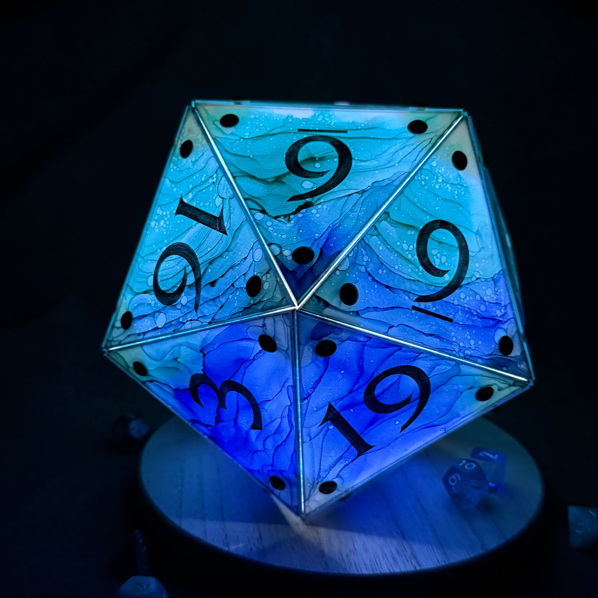 Circle of the Sea is a handpainted D20 Driftglobe lamp! Each of the 20 panels was painted with bright teal and blue alcohol inks. Some panels have a splatter of glow in the dark bubbles like bioluminescence. The numbers are inked with a silver alcohol ink and then sealed.