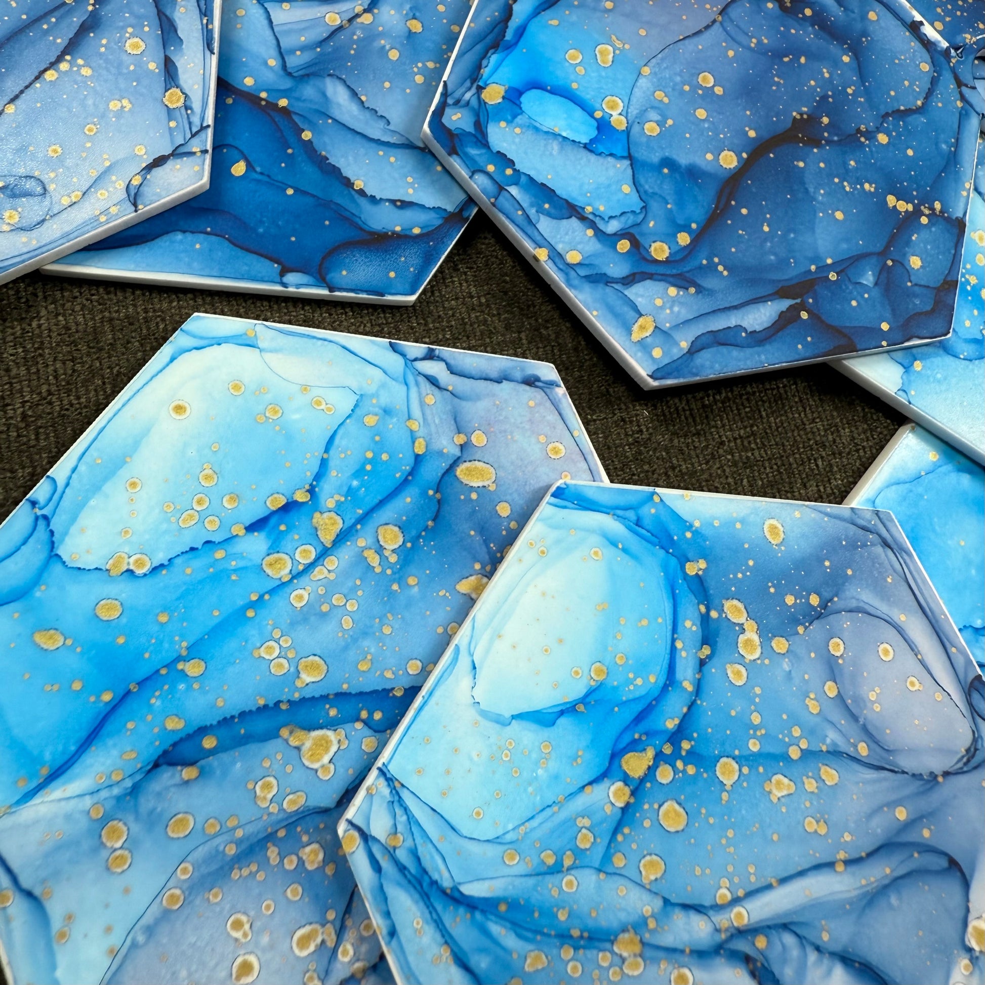 Each ornament is hand-painted with alcohol inks to be completely unique. This means that each one is different, the colors may vary slightly, and I probably got some ink on the white of the sides!