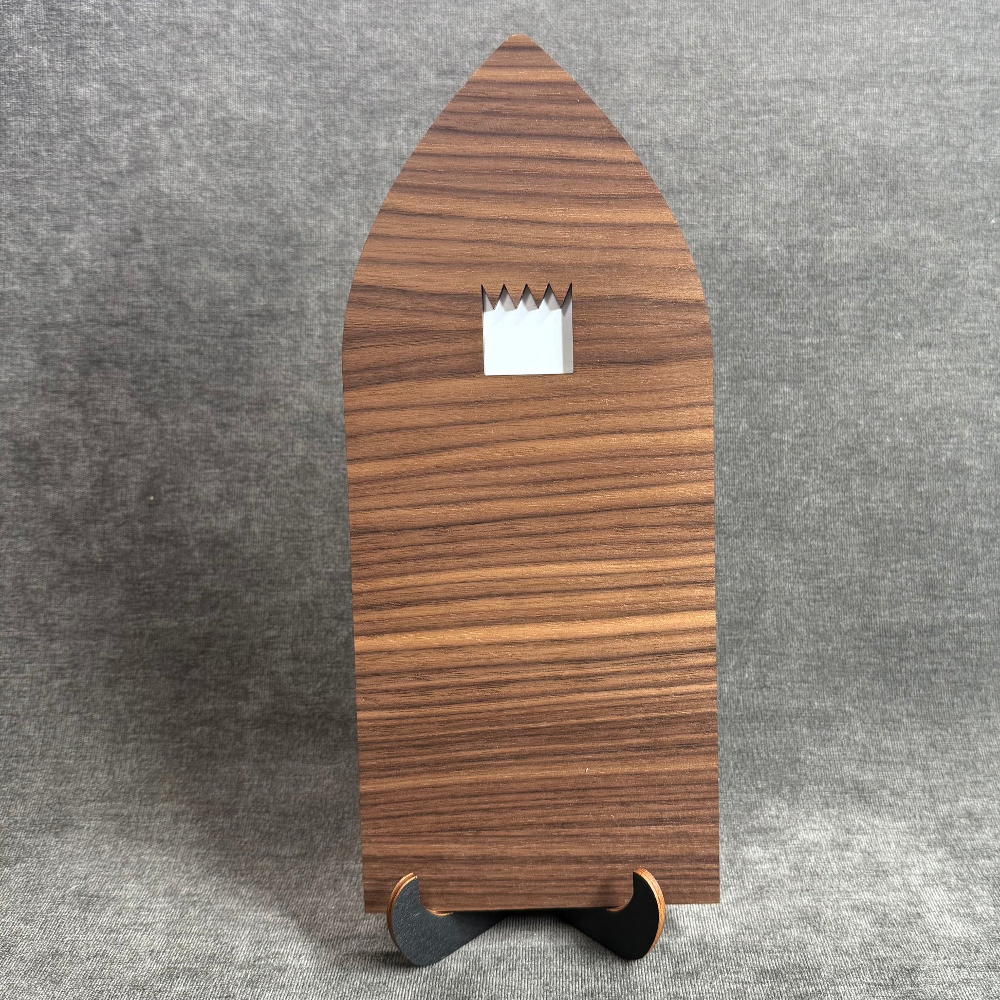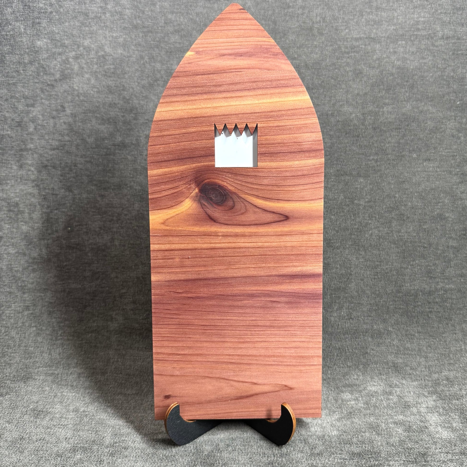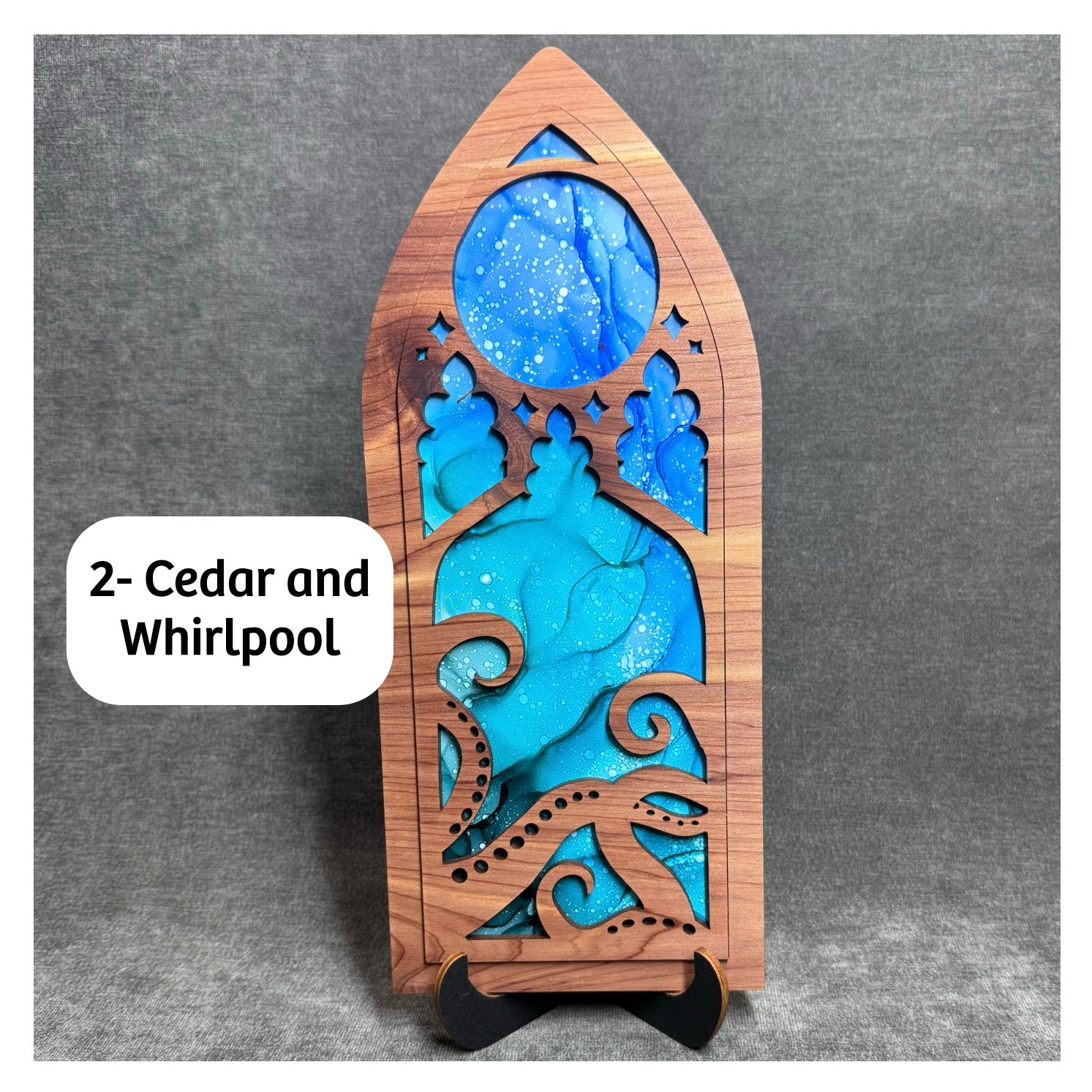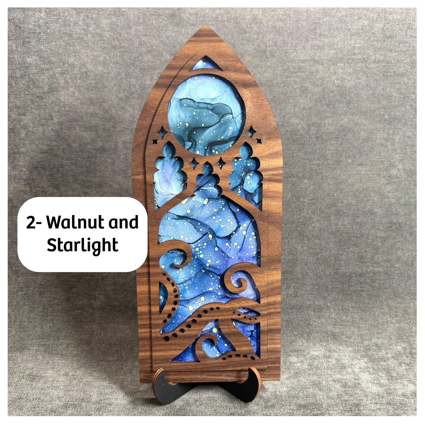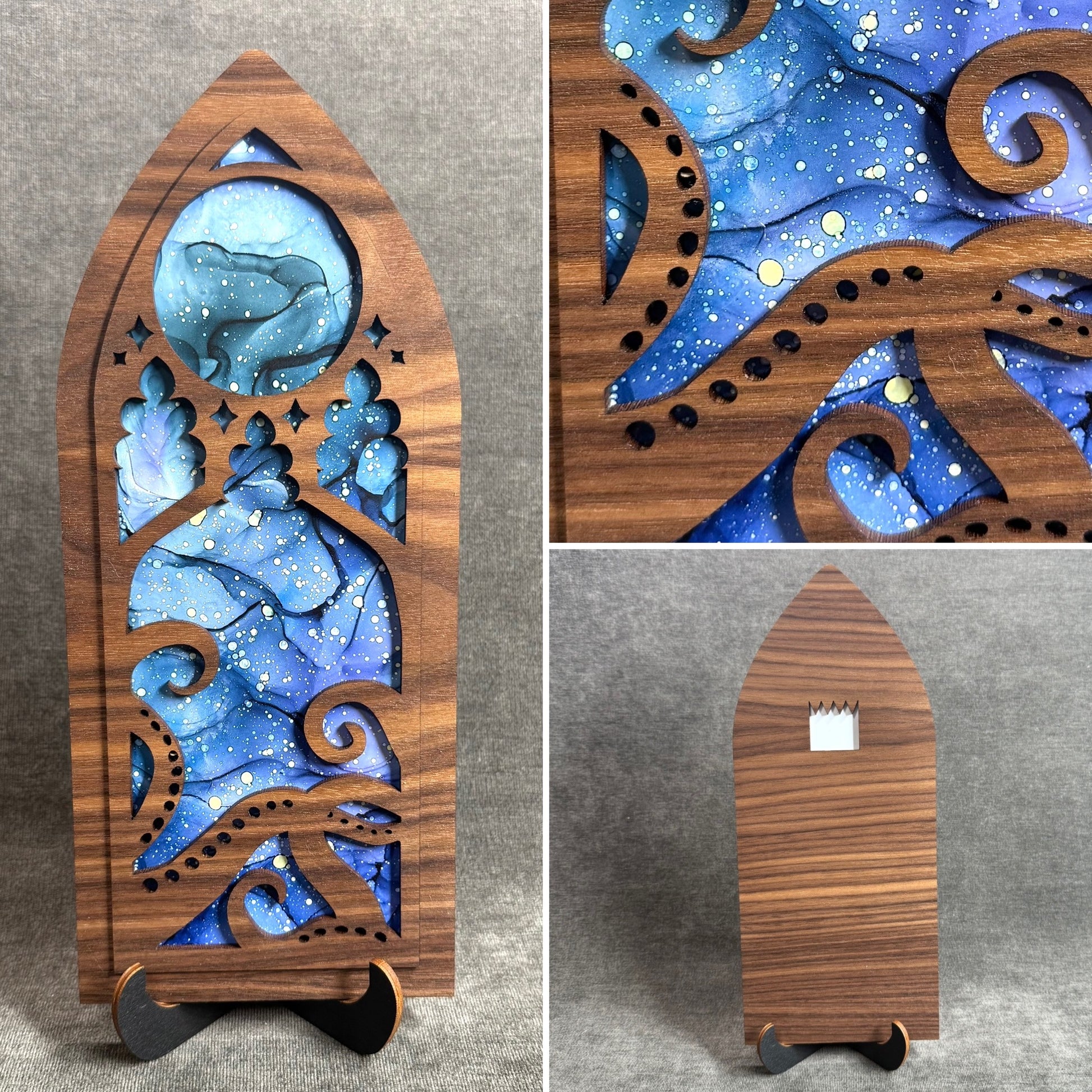 These pieces are 10.5 inches tall, 4.4 inches across, and about a quarter inch thick. It is made of laser cut veneer wood and hand painted acrylic with alcohol inks. The back has a cutout to assist with easy hanging.