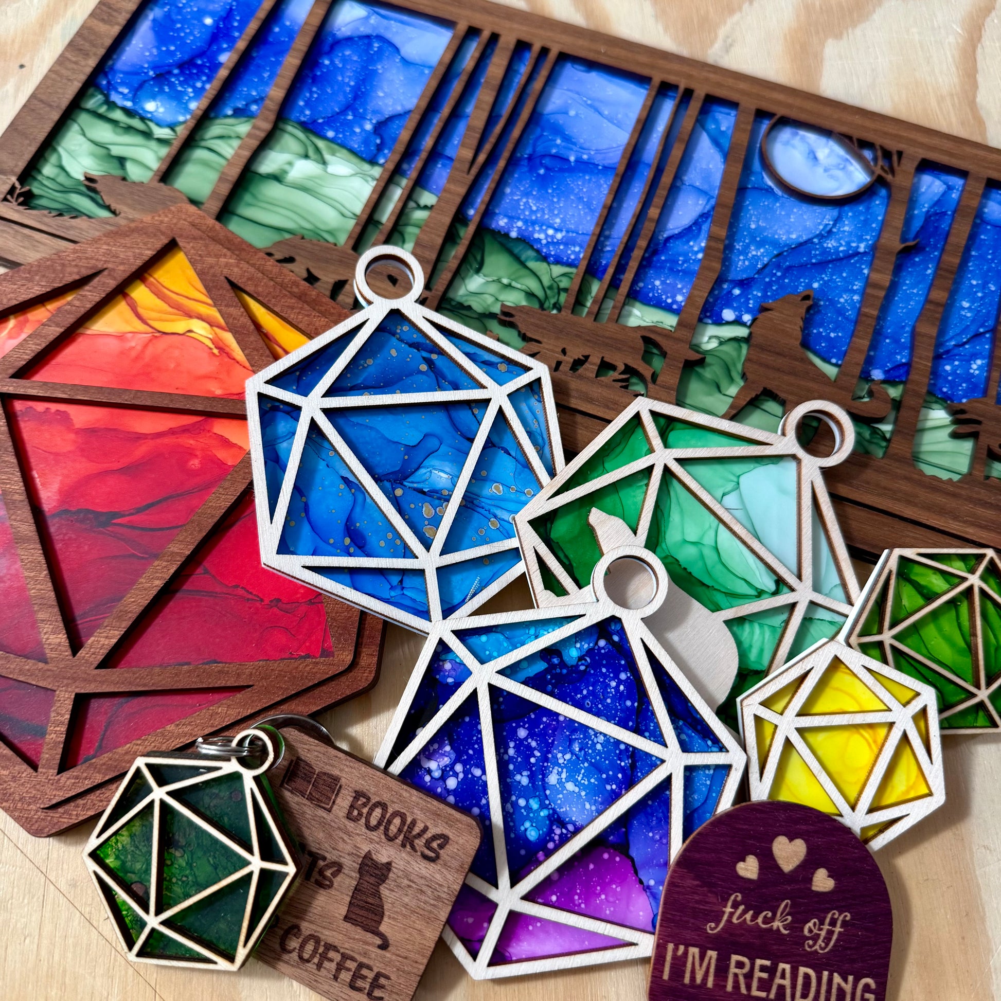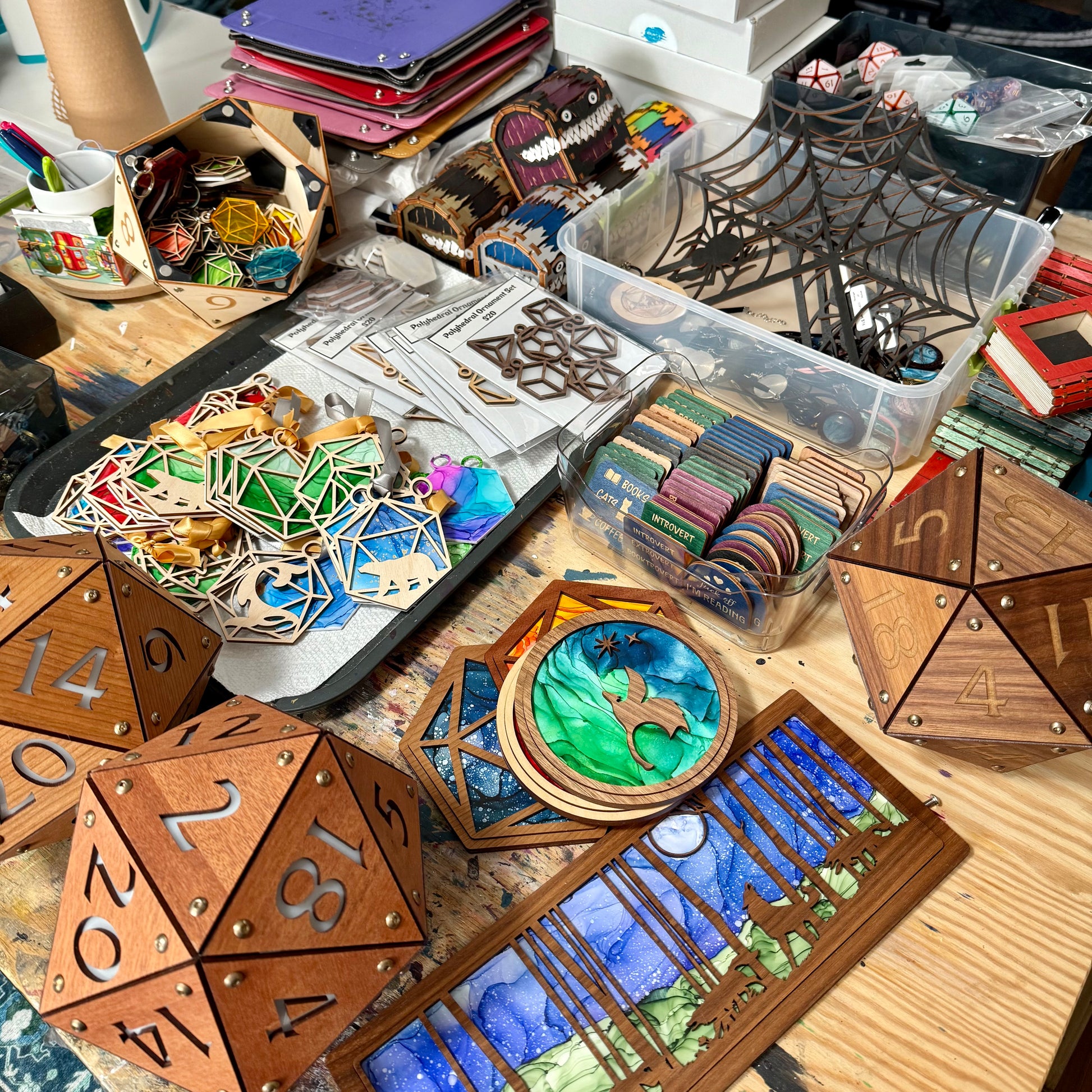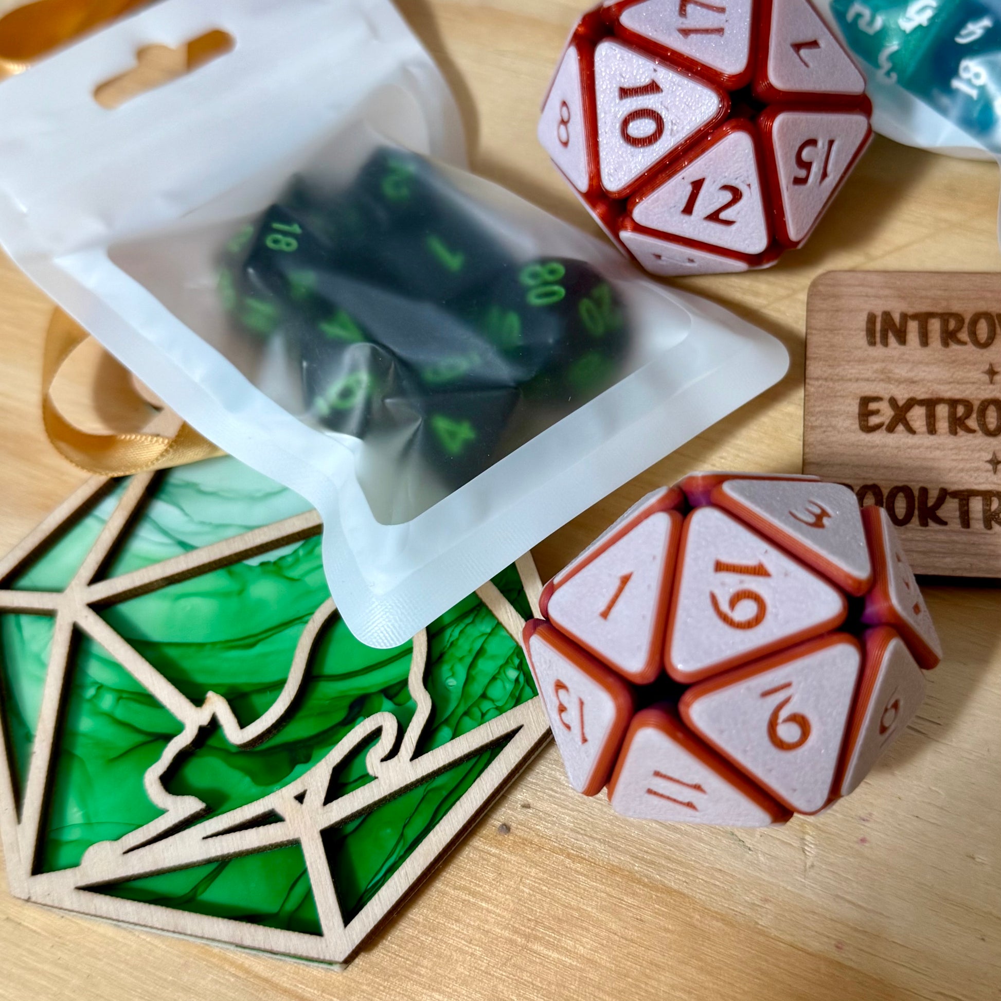 Small: 1 B grade fidget D20, a hand painted ornament, 1 random dice set. $50+ worth of products